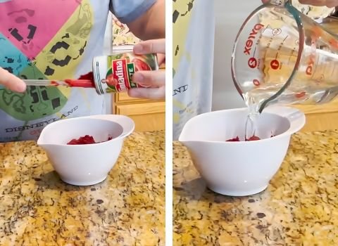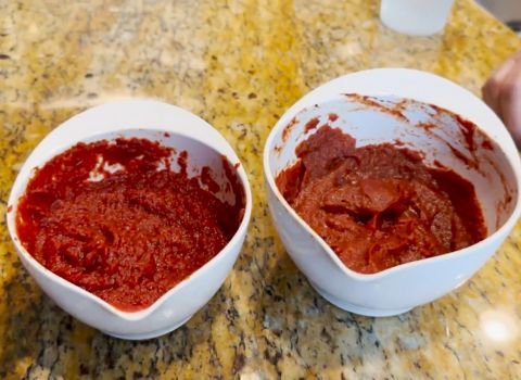- Open your can of tomato paste and put it all into your mixing bowl. Measure exactly four ounces of water in your liquid measuring cup. Pour the water into the bowl with the tomato paste.