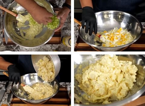 5. Add the diced onion, celery, and chopped eggs into the bowl. Fold gently with the dressing until everything is coated. Next, add the warm potatoes. Mix slowly using a wooden spoon or spatula, folding the potatoes instead of mashing them. This helps keep the chunks intact while still allowing some edges to blend into the sauce, giving it a creamy texture.
