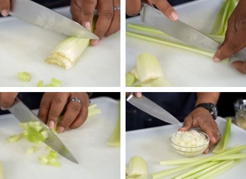 3. Dice the yellow onion and celery into small bits. The goal is to add crunch without overpowering the smooth potatoes. Set them aside.