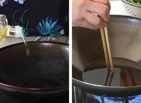 Pour oil into a wok or deep pan until it reaches about half an inch deep. Heat the oil on medium-high heat. Place a bamboo utensil into the oil. When small bubbles form fast around it, the oil is ready.
