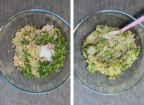 - In a large bowl, add 1 cup shrimp paste, 1/3 cup finely chopped onions, 2tbsp chopped green chili, 2tbsp chopped coriander, 2tbsp mint, 1tbsp finely chopped lemon grass, 1tbsp lemon juice, 1tsp soy sauce, 1tsp fish sauce, 1/2tsp oyster sauce, 1/2tsp black pepper, 1/2tsp tasting salt, and 1/2tsp salt. Mix everything until it comes together well and smells fresh.
