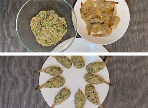 - Take one shrimp and spoon some mixture on top, shaping it gently around the shrimp body. Cover the shrimp except for the tail, which should stay free. Repeat for all shrimp.