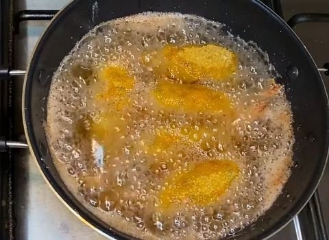 Last, roll in orange breadcrumbs. Press gently so the crumbs stick. - Heat enough oil in your frying pan to cover at least half the shrimp. Once hot (not smoking), place the shrimp in the pan.