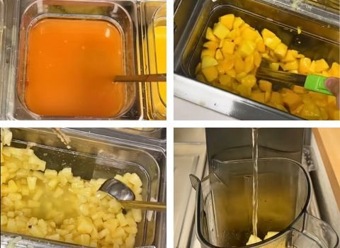 - Place guava, mango, pineapple, turbinado sugar, and water into a blender.