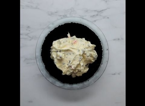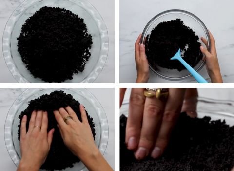 - Place chocolate sandwich cookies in a food processor and pulse into fine crumbs. Transfer to a mixing bowl, pour in melted butter, and stir until the texture resembles wet sand. Press the mixture evenly into a 9-inch pie dish, slightly up the sides. Freeze the crust while preparing the filling.