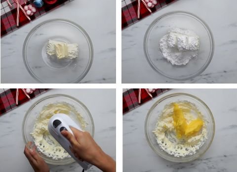 In a large bowl, add the softened cream cheese, softened butter, and powdered sugar. Beat together until light and fluffy.