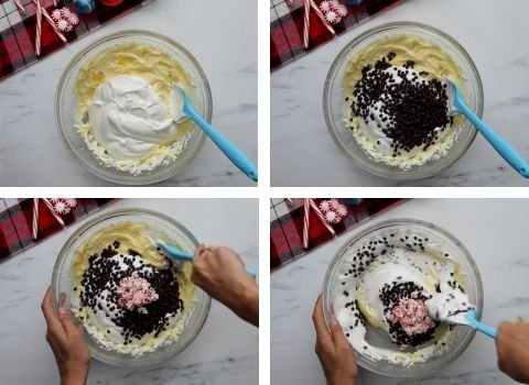 - Gently fold in half the whipped cream, mini chocolate chips, and crushed candy canes until evenly combined and airy.
