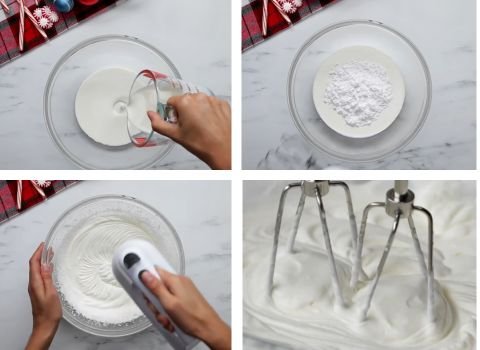 - In a clean bowl, combine 1 cup heavy cream, peppermint extract, and powdered sugar. Beat with an electric mixer on medium speed until stiff peaks form. Set aside.